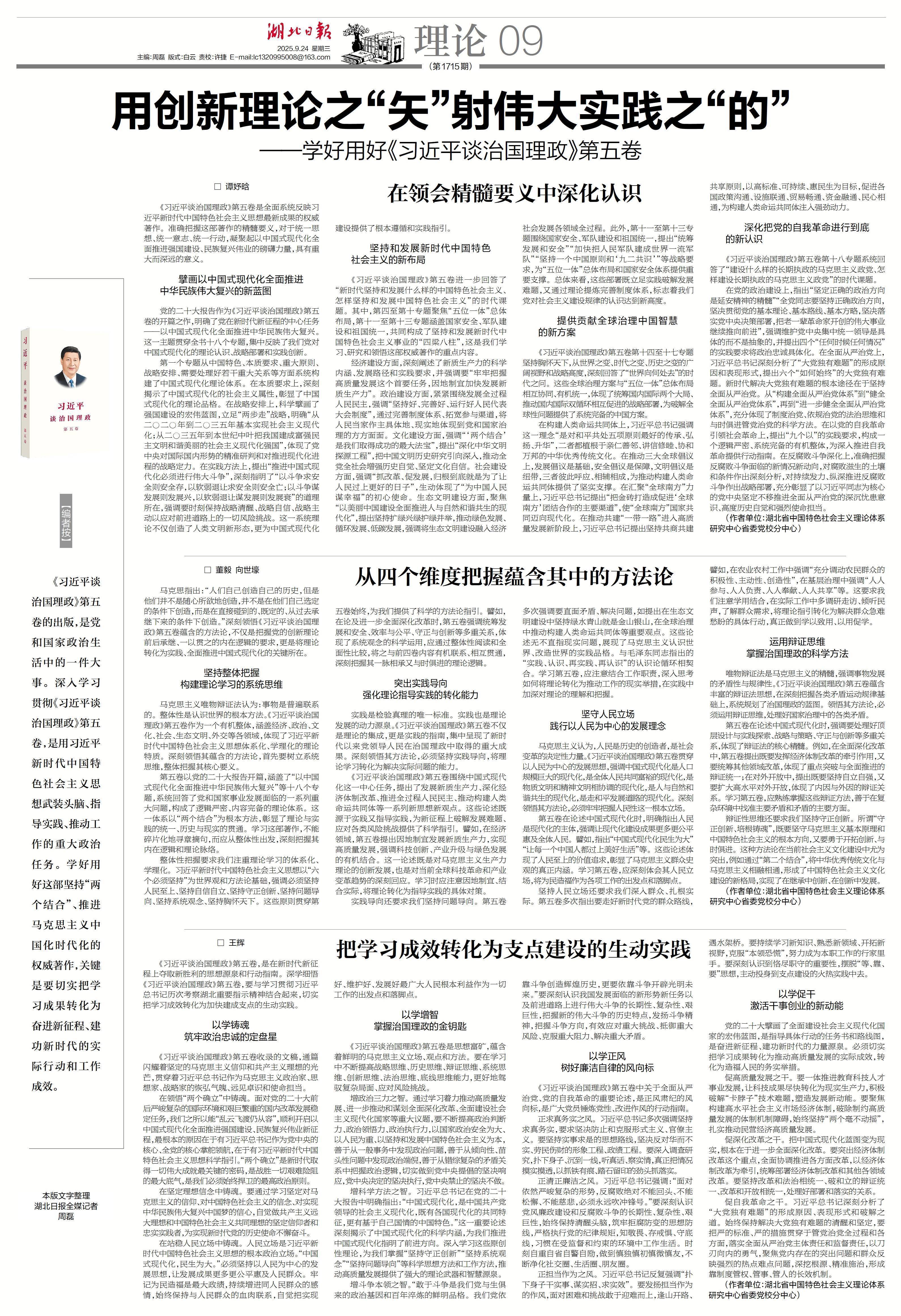 《习近平谈治国理政》第五卷,是在新时代新征程上夺取新胜利的思想源泉和行动指南。深学细悟《习近平谈治国理政》第五卷,要与学习贯彻习近平总书记历次考察湖北重要指示精神结合起来,切实把学习成效转化为加快建成支点的生动实践。